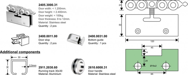 |  | Bộ phụ kiện cửa lùa ray inox tròn D25 cánh nặng 150kg( 2 bánh xe treo Inox, 1 dẫn hướng dưới, 2 chốt hãm bánh xe, bộ liên kết tường # kính, roang ) | Bộ | 2,800,000 |
